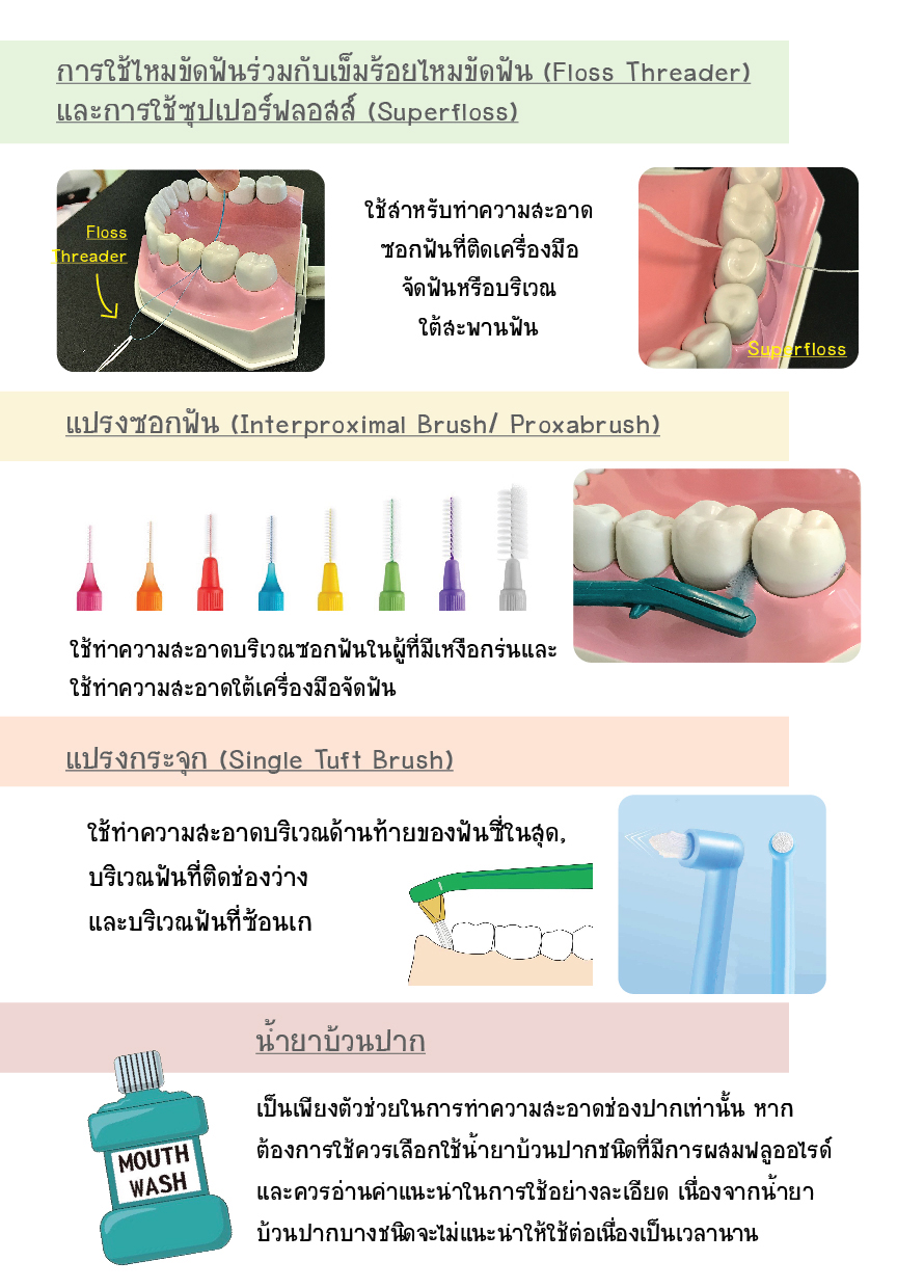 เศษอาหารและคราบจุลินทรีย์ในช่องปาก เป็นสาเหตุสำคัญที่ทำให้เกิดโรคฟันผุและโรคปริทันต์ การทำความสะอาดช่องปากอย่างถูกวิธีโดยการแปรงฟัน ร่วมกับการทำความสะอาดซอกฟัน ด้วยอุปกรณ์เสริมชนิดต่างๆ ที่เหมาะสมจึงถือเป็นสิ่งที่สำคัญ ในการป้องกัน เพื่อไม่ให้เกิดโรคต่างๆ ในช่องปาก